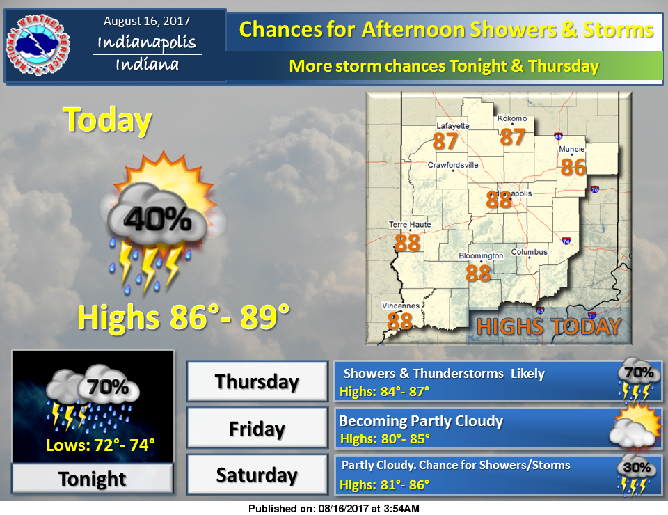 Look for Increasing Clouds today with chances for afternoon Showers and Storms. High temperatures will be in the mid to upper 80s. More rain chances are expected tonight and Thursday.