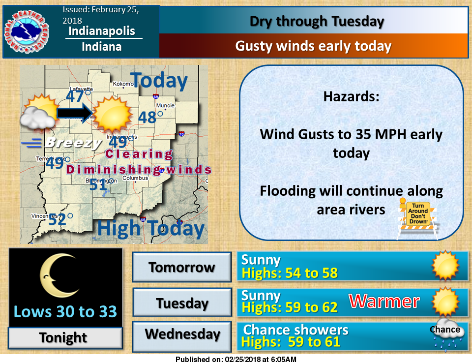 “Wind gusts to 35 MPH early this morning. Otherwise…clearing skies and decreasing winds today. Cooler with highs in the upper 40s to lower 50s. Dry weather will continue through Tuesday…then showers again Wednesday and Thursday.”