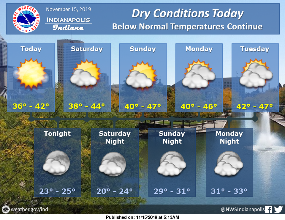 Mostly sunny skies today across central Indiana with dry conditions expected through the weekend. Below normal temperatures will continue into next week.