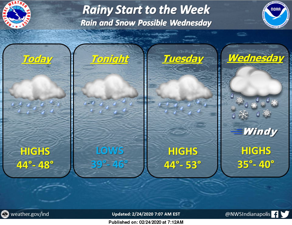 Feb 24, 2020: Indy Weather Forecast February 24, 2020 by Naptown Buzz Rain will continue to overspread central Indiana this morning as a low-pressure system approaches the region. The rain will persist through mid-week, and some snow could mix in on Wednesday with colder air. Via https://www.weather.gov/ind/weatherstory. Spread the love ADVERTISING NOTICE Some posts and pages on Naptown Buzz contain affiliate links for which we receive an affiliate commission. Additionally, you can support Naptown Buzz by making your everyday Amazon purchases through our Amazon link.