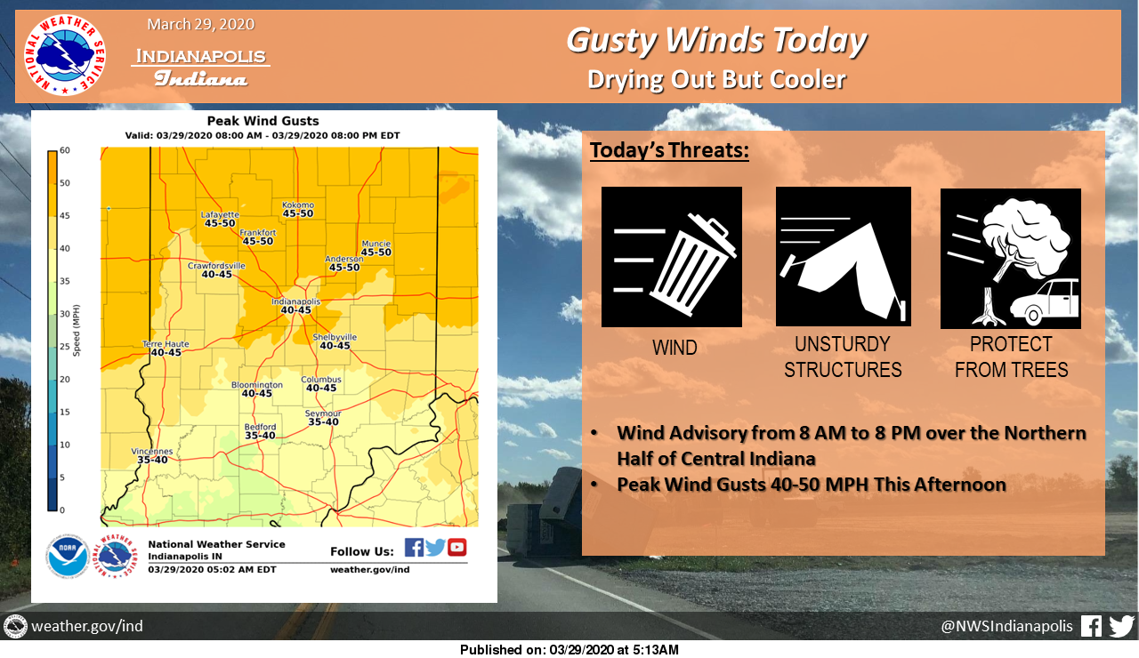Windy and cooler today. Gusts between 30 and 50 mph will be common. Highs around 60°. #INwx pic.twitter.com/Xy1iRxnsTt