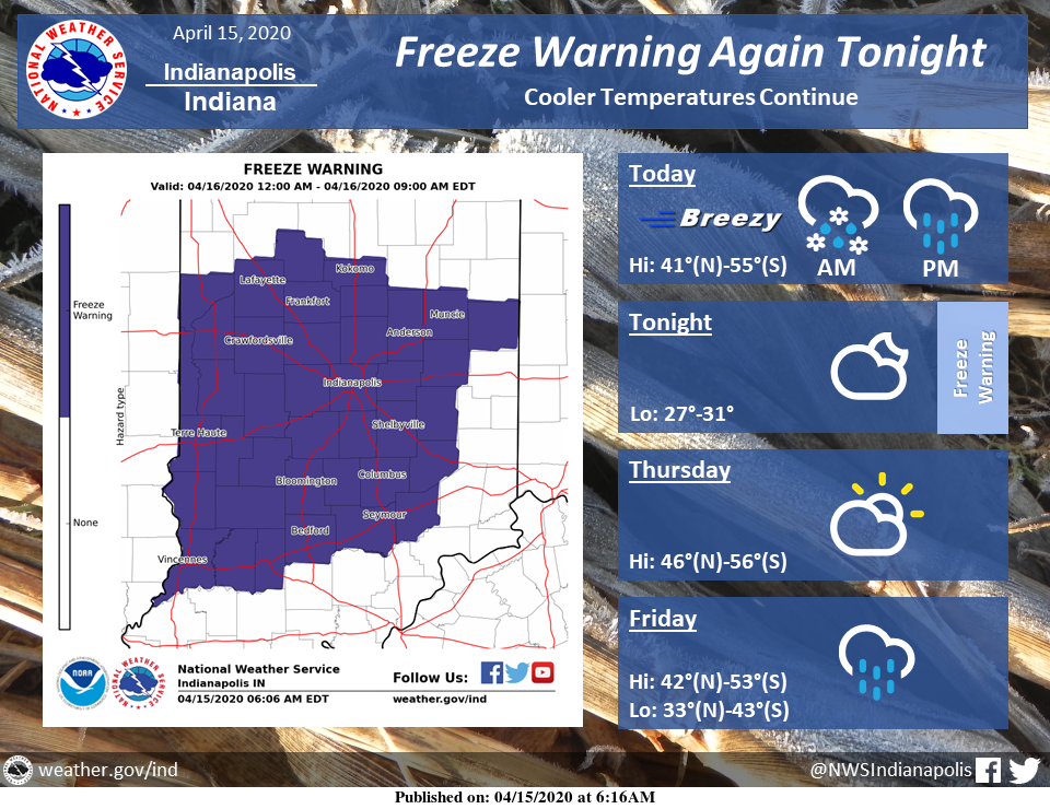 A freeze warning will be in effect again tonight for all of central Indiana, with lows of 27-31 degrees expected.