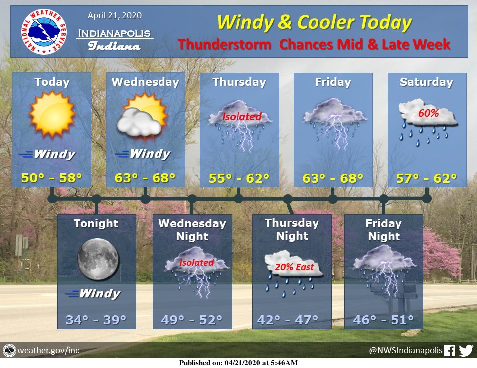 Windy and cooler today, and dry through Wednesday. However, a more active pattern will bring rain and thunderstorm chances to central Indiana starting Wednesday night.