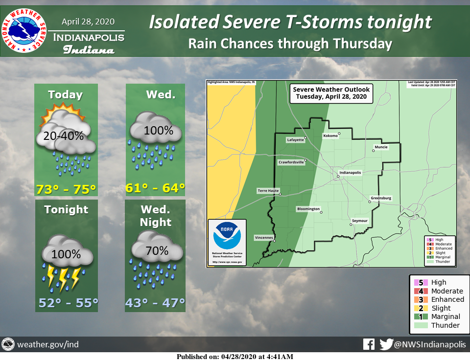 A few light showers are possible this morning, with PLENTY of dry time today. Mostly cloudy skies this afternoon with highs in the low to mid 70s! Isolated severe storms arrive mid evening for western Indiana. Line will weaken traveling across the state. @WISH_TV #INwx #Indy pic.twitter.com/JGp8PsA9Ye