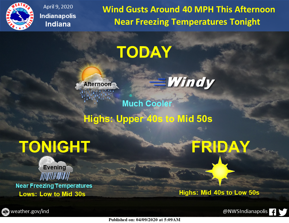 Active evening yesterday with severe storms and lots of damage. Much cooler behind the front with highs almost 30° cooler than yesterday! Highs will top out in the upper 40s to near 50°. Could also see a few afternoon sprinkles. @WISH_TV #Indy #INwx pic.twitter.com/lwvYJEKa7q