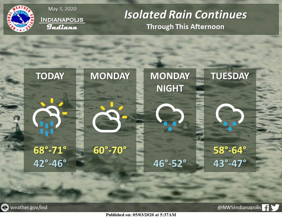 Highs drop from near 70 today to the upper 50s next week. The cooler trend in the forecast. #13Weather #INwx @wthrcom | https://t.co/pokma2Xt8r pic.twitter.com/OyStlVIiuj— Lindsey Monroe (@LindseyWTHR13) May 3, 2020