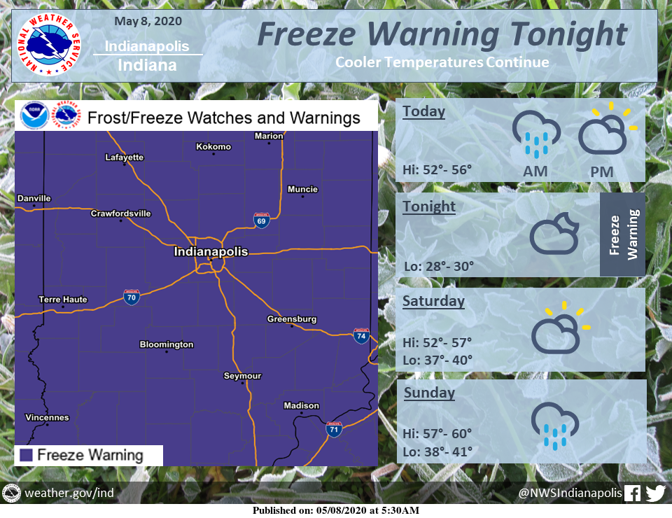 It is rainy and chilly this morning, and there’s no warmup in sight. We won’t even see 60° this weekend. There is a freeze warning for tomorrow morning, so make sure to cover your plants! https://t.co/YPfBR3Ucsc #INwx #FOX59morning